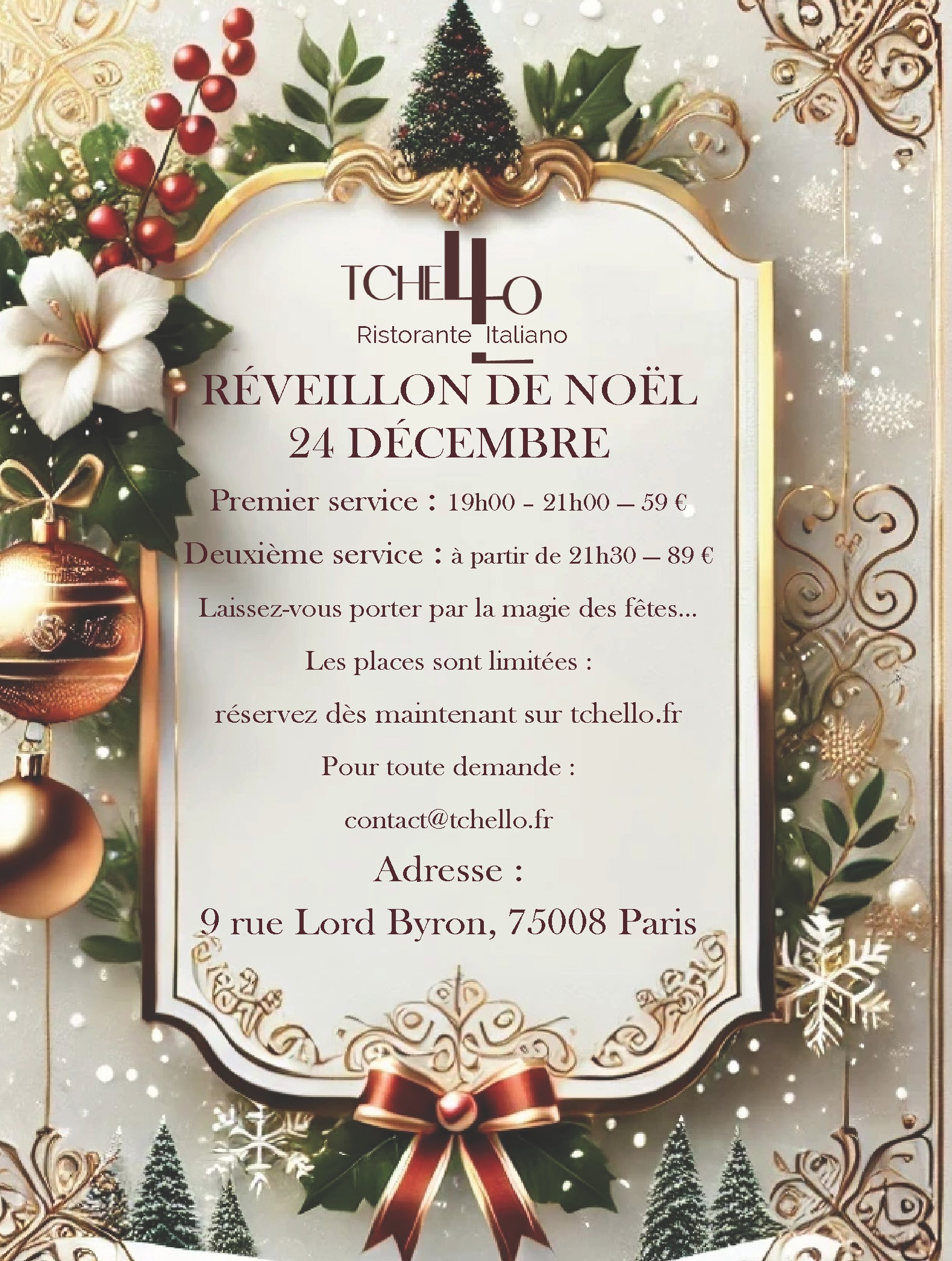 Vier kerstavond bij Tchello, in het hart van de Champs-Élysées, in een warme en elegante sfeer. Twee diensten wachten op je: van 19:00 tot 21:00 voor 59 € en vanaf 21:30 voor 89 €. Geniet van een feestelijk diner in een verfijnde setting. De plaatsen zijn beperkt, reserveer nu op tchello.fr of neem contact met ons op.